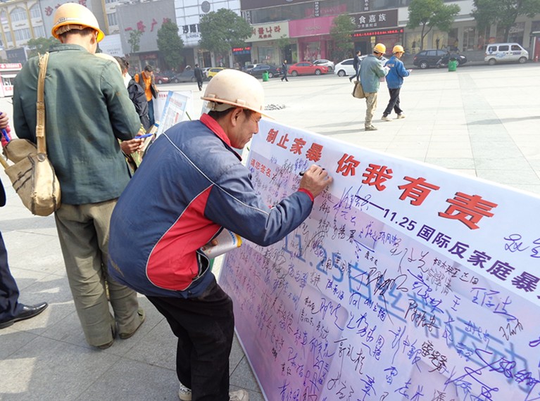 11月25日上午,荆州市妇联在市中心沙隆达广场举办以白丝带为背景开展“制止家暴,你我有责”的万人签名活动,数千名居民群众在宣传条幅上签字。